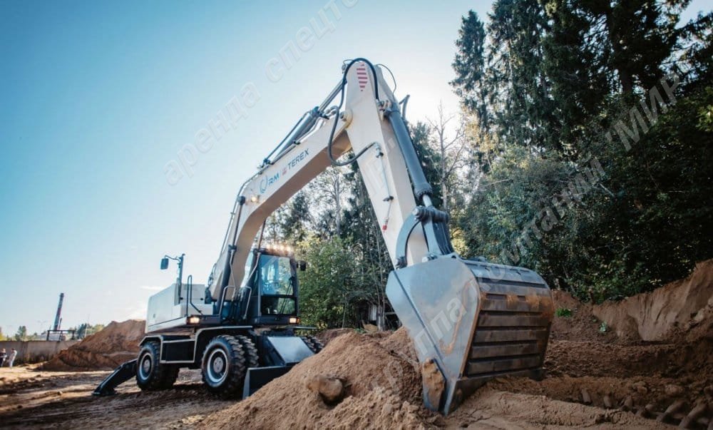 Данный экскаватор на колёсном шасси, с вылетом стрелы в 6 метров способен выполнять земляные работы на глубину 5.6 метров.