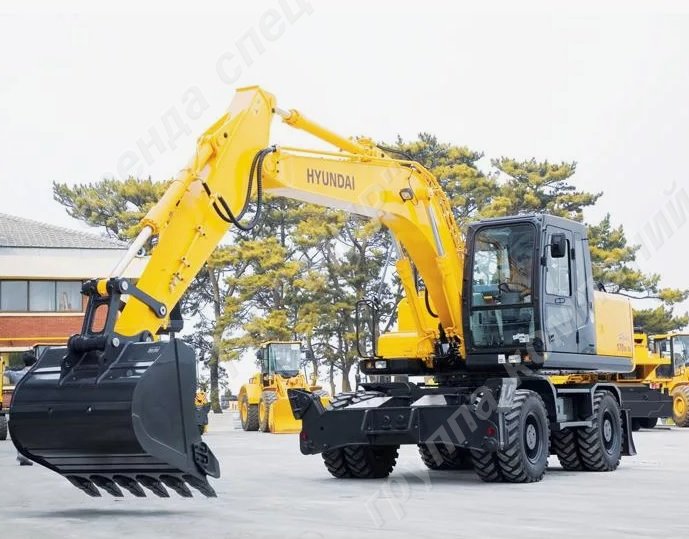 Колёсный экскаватор Хюндай R170w с вылетом стрелы в 5,1 метра. Экскаватор способен выполнять земляные работы на глубину 5,4 метра, полноповоротный.